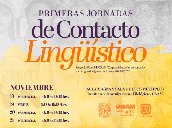 El Instituto de Investigaciones Filológicas de la UNAM anuncia las Primeras Jornadas de Contacto Lingüístico, a celebrarse del 18 al 21 de noviembre de 2025. Se invita a los interesados a solicitar información adicional, así como a realizar el registro para las sesiones virtuales, mediante el correo electrónico: jornadascontacto1@gmail.com.